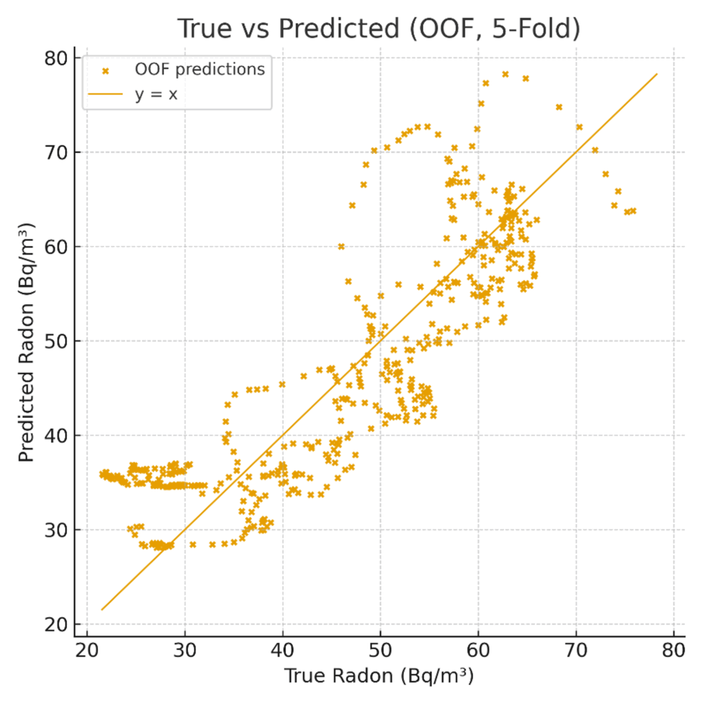 점선은 완전일치선(y = x)**이며, 각 점은 예측과 해당 시점 실측의 한 쌍을 의미한다. 분산과 치우침을 직관적으로 확인하기 위해 OOF만 별도로 도식화하였다. (단위: Bq/m³)