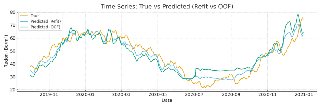 주황=실측(True), 파랑=Refit, 녹색=교차검증 예측(OOF). (단위: Bq/m³)