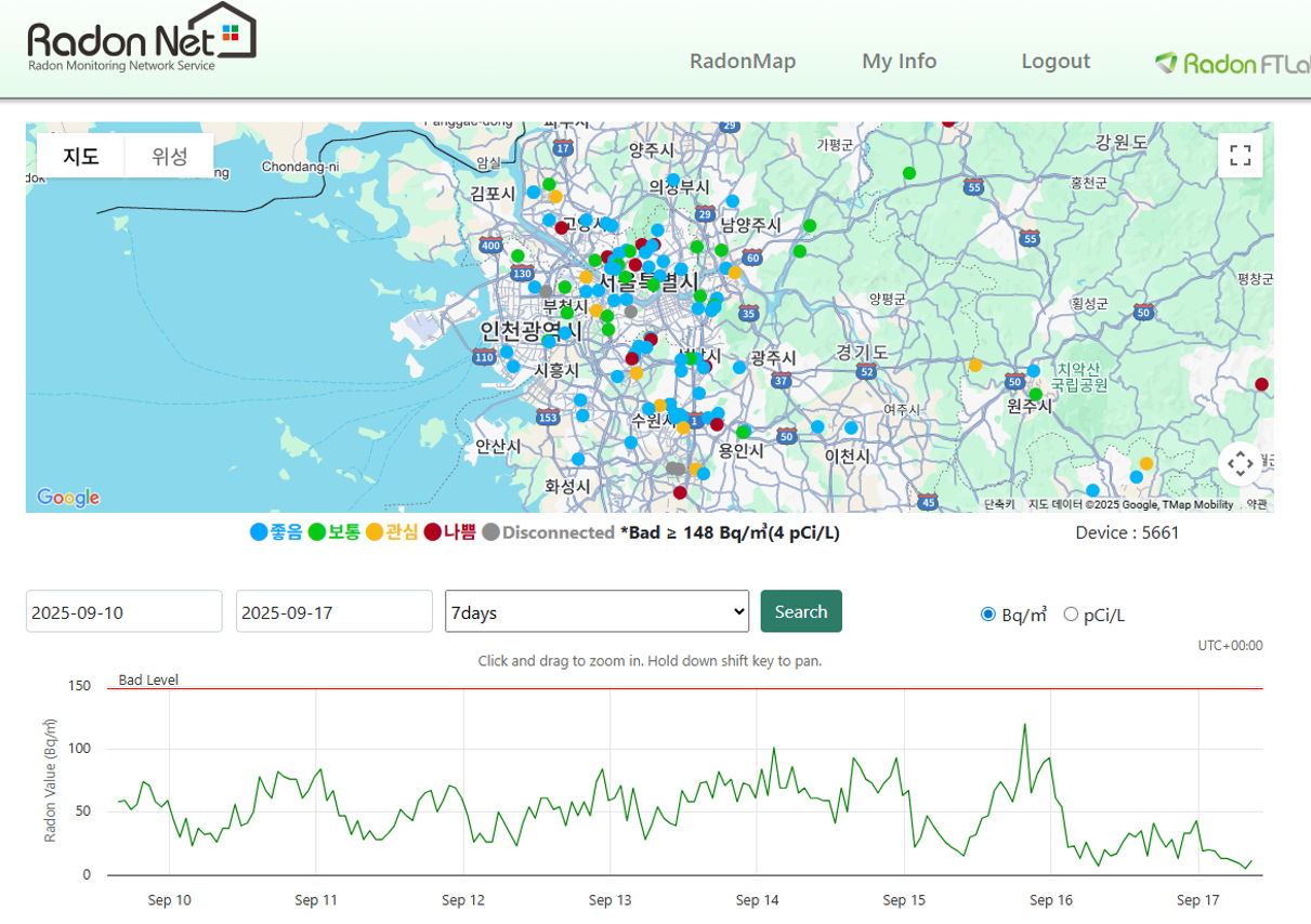 • 라돈넷은 (주)에프티랩에서 2018년도부터 운영중인 라돈모니터링 시스템에서 서울지역 810여대의 라돈측정센서(모델명 라돈아이P2/라돈아이PRO)에서 서버로 upload된 data를 사용하였다. 참고로 현재 라돈넷에 등록된 실시간 라돈측정센서는 5,600여개이며, 관계회사인 ECOSENSE.INC(USA)에서는 data 저장이 가능한 라돈모니터링 장치(모델명 EcoQube) 47,000여대를 운영중에 있다[3].